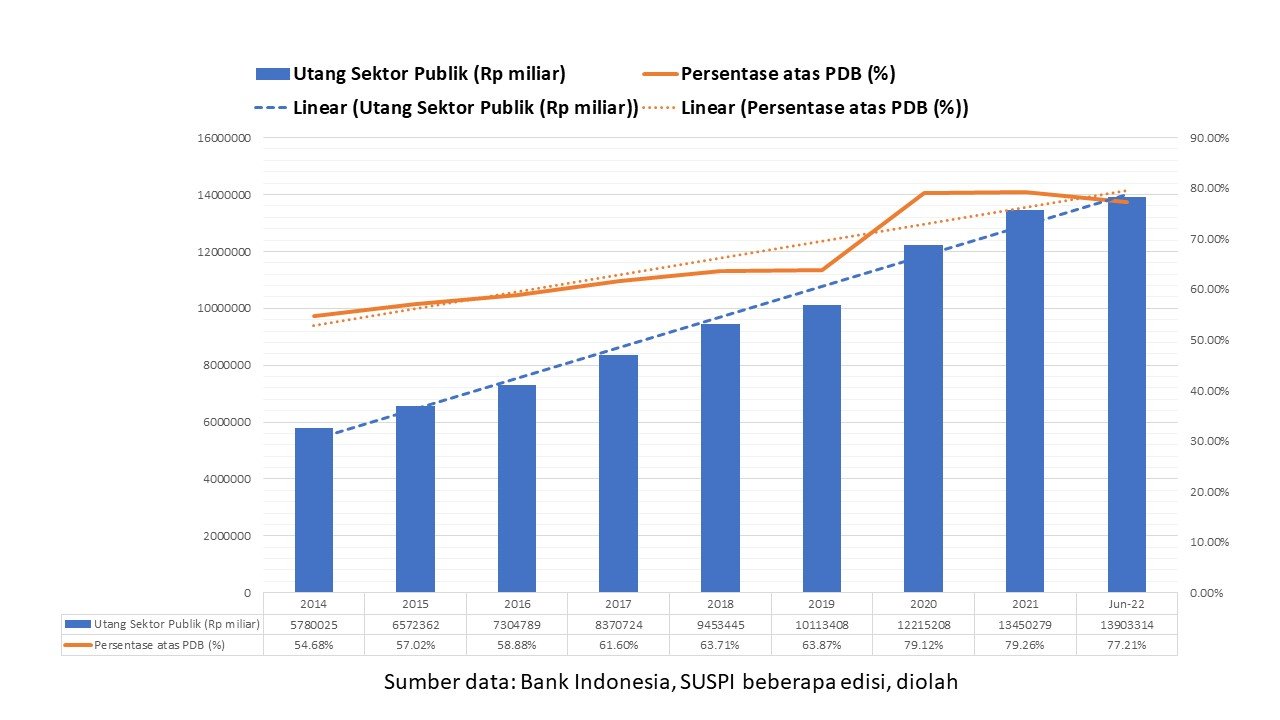 Posisi utang sektor Publik cenderung meningkat secara nominal maupun rasionya atas PDB selama beberapa tahun terakhir. Terutama karena kenaikan utang Pemerintah dan utang BUMN. Tren itu terjadi sejak sebelum era pandemi. Dampak pandemi kemudian menambah laju peningkatannya.