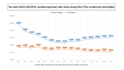Pada saat bersamaan, tax ratio justru cenderung menurun. Sempat meningkat tahun 2018 karena kebijakan tax amnesty, sehingga mencapai 11,53%. Merosot drastis pada 2019 menjadi sebesar 10,73%.